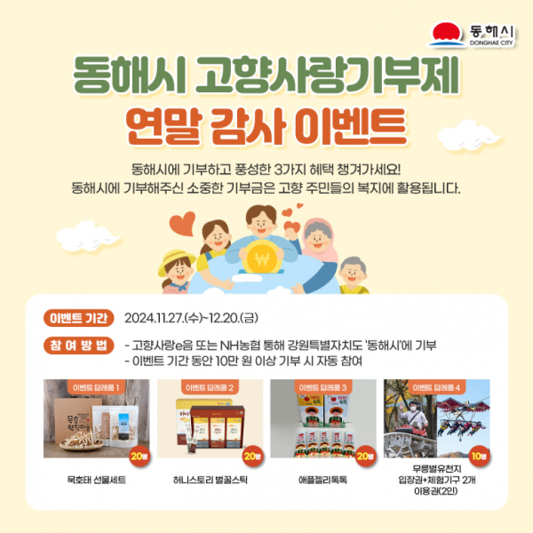 고향사랑기부제 연말 감사 이벤트는 오는 12월 20일까지 동해시에 10만원 이상 기부한 시민 70명을 무작위로 선정해 다양한 경품을 증정할 예정으로 기부자들은 세액 공제 혜택과 답례품을 받는 동시에 경품으로 동해시 특산품인 묵호태 선물세트, 애플젤리톡톡 세트, 무릉별유천지 입장권과 체험시설 이용권 등을 받을 수 있다.