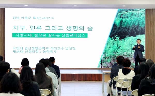[아시아월드뉴스] 하동군은 지난 3일 오전, 남성현 전 산림청장을 초청해 ‘지구, 인류 그리고 생명의 숲’ 이라는 주제로 특강을 진행했다고 밝혔다.