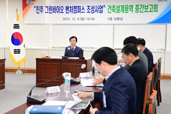 [아시아월드뉴스] 진주시는 지난 9일 시청 5층 상황실에서 조규일 시장과 공공건축가, 관계 공무원 등이 참석한 가운데 ‘진주 그린바이오 벤처캠퍼스 조성사업’ 건축설계용역 중간보고회를 가졌다.