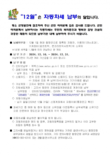 [아시아월드뉴스] 함양군은 2024년도 12월 정기분 자동차세 12억 6,050만원을 부과하고 납세 홍보에 나섰다.