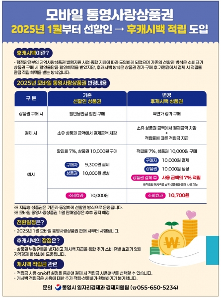 모바일 통영사랑상품권은 2025년 1월 판매시부터 후캐시백 방식으로 전환되며지류형 통영사랑상품권은 기존과 동일하게 선할인 방식으로 운영되어 관내 농축협에서 구매할 수 있다.