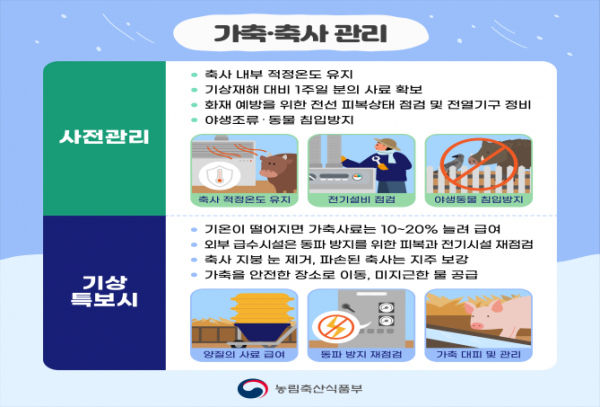 구체적으로는 축사 내부 적정 온도를 유지하고 폭설에 대비해 최소 1주일 분량의 사료를 확보하며 축사 화재 예방을 위해 피복 상태와 전열기구를 점검하도록 했다.