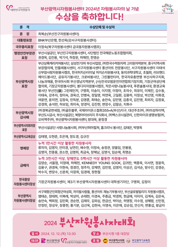 자원봉사 유공 국민훈장 석류장 1점, 대통령표창 1점, 국무총리표창 1점, 행정안전부장관표창 7점, 부산광역시장표창 27점, 부산광역시의회의장표창 4점, 부산광역시교육감상 3점, 자원봉사 명예장 16점, 자원봉사 금배지 17점 등 총 94점을 수여해 자원봉사자들을 격려할 계획이다.