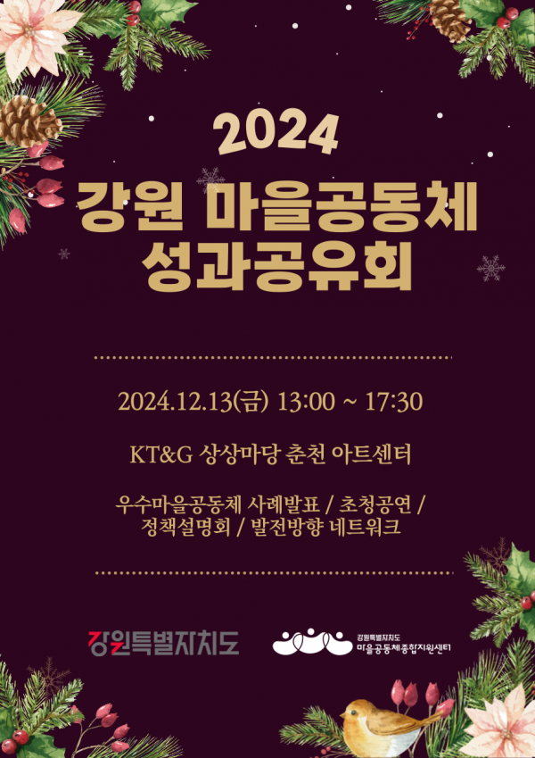 [아시아월드뉴스] 강원특별자치도는 `24년 강원 마을공동체를 대상으로 12월 13일 오후 1시부터 KT&G 상상마당 춘천아트센터에서 “2024 강원 마을공동체 성과공유회”를 개최한다고 밝혔다.