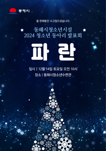 [아시아월드뉴스] 동해시는 오는 12월 14일에 동해시청소년수련관에서 2024년도 동해시청소년동아리 발표회 ‘파란’을 개최한다고 밝혔다.