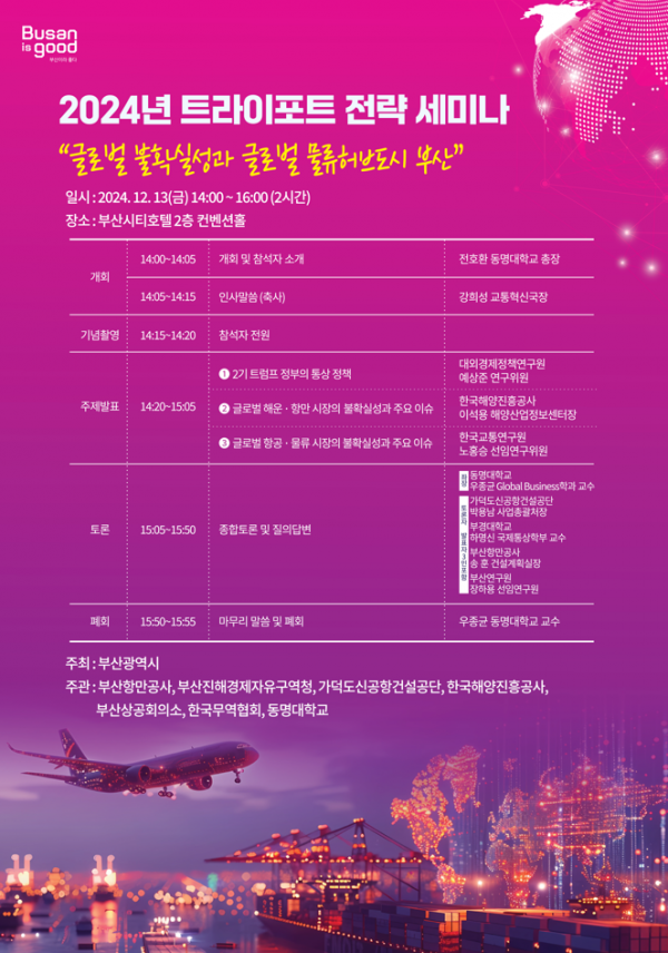 [아시아월드뉴스] 부산시는 오늘 오후 2시 부산시티호텔 컨벤션홀에서 ‘2024 트라이포트 전략 세미나’를 개최한다고 밝혔다.