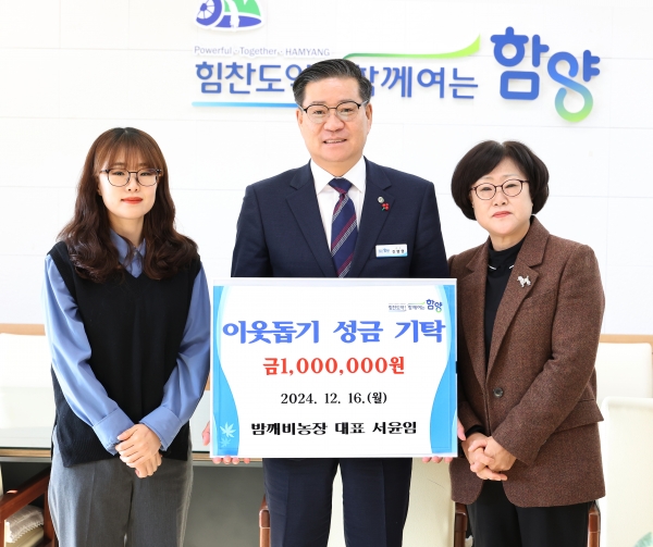 이날 밤깨비농장 서윤임 대표가 함양군청을 방문해 이웃돕기 성금 100만원을 기탁하며 “앞으로도 꾸준히 나눔 활동에 기여하고 싶다”고 밝혔다.