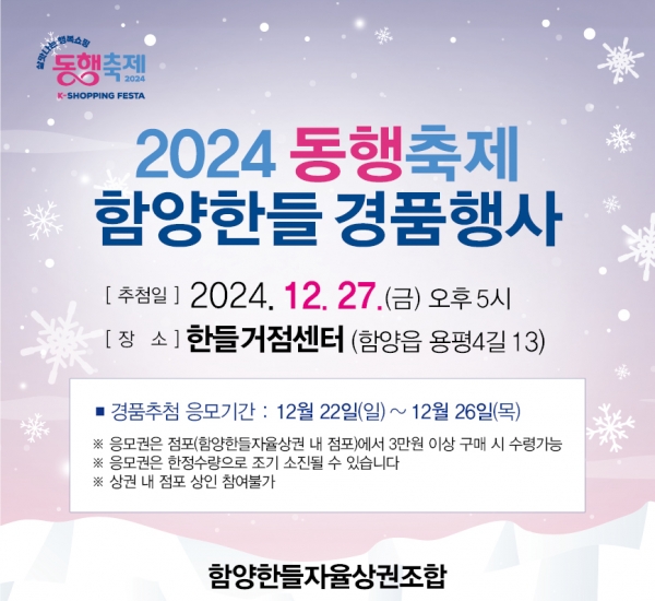 [아시아월드뉴스] 2024 동행축제의 일환으로 함양한들 경품행사 및 상권 이벤트가 오는 12월27일 오후 5시부터 함양한들거점센터에서 열린다.