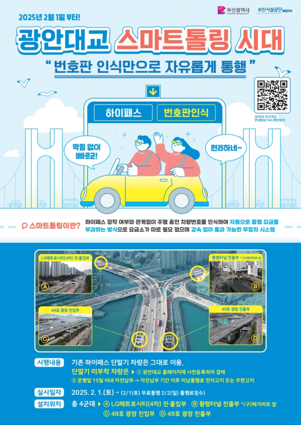 [아시아월드뉴스] 부산시와 부산시설공단은 지자체 관리 유료도로 중 전국 최초로 '광안대교 스마트톨링시스템'을 내년 2월 1일부터 본격 시행한다고 밝혔다.