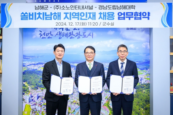 [아시아월드뉴스] 남해군, ㈜소노인터내셔널 쏠비치 남해, 경남도립남해대학은 17일 남해군청에서 ‘쏠비치 남해 지역인재 채용을 위한 업무협약’을 체결했다.