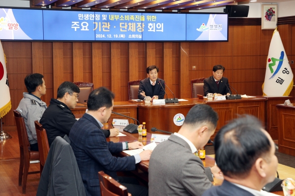 [아시아월드뉴스] 밀양시는 19일 오후 시청 소회의실에서 대통령 탄핵 정국에 대응해‘민생안정 및 내부 소비 촉진을 위한 주요 기관·단체장 회의’를 열고 지역 경제 회복과 시민 불안 해소 대책을 논의했다.