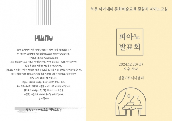 [아시아월드뉴스] 12월 20일 오후 5시, 화개면 신흥마을 커뮤니티센터에서 하동아카데미 랄랄라 피아노교실 수강생들의 연주회가 열린다.