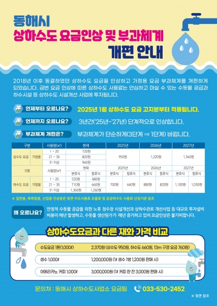 [아시아월드뉴스] 동해시는 오는 2025년 1월부터 가정용 상하수도 사용료 누진제를 폐지하고 2025년부터 2027년까지 3년간 매년 점진적으로 요금을 인상하는 등 상하수도 요금부과 체계를 개편한다고 밝혔다.