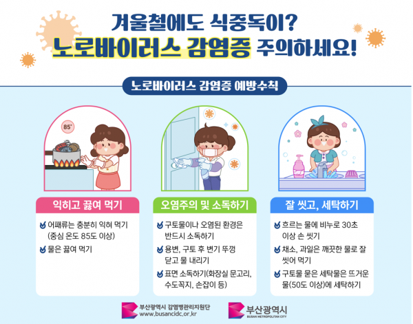 이소라 시 시민건강국장은 “겨울철 노로바이러스 감염증을 예방하기 위해 위생 수칙을 준수해 안전하게 조리된 음식을 섭취하고 비누 등을 사용한 올바른 손 씻기 등 예방수칙을 잘 지켜주시기를 당부드린다”고 전했다.