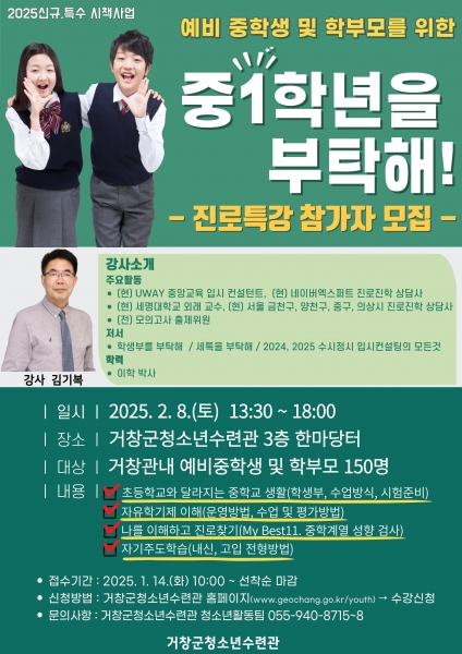 ‘중 1학년을 부탁해’ 진로특강은 2025년 2월 8일 오후 1시 30분, 거창군청소년수련관 3층 한마당터에서 진행될 예정이며 참가 신청은 1월 14일 오전 10시부터 청소년수련관 홈페이지를 통해 선착순으로 150명을 모집한다.