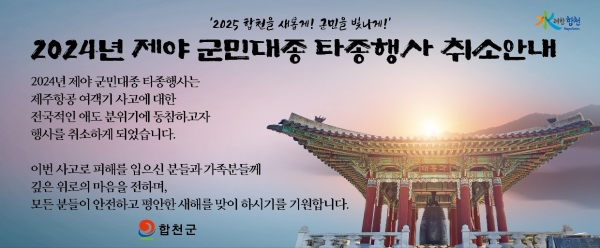 [아시아월드뉴스] 합천군은 31일 밤부터 다음달 1일 군민대종각 일원에서 열릴 예정이던 ‘2024년 제야 군민대종 타종행사’를 취소한다고 30일 밝혔다.