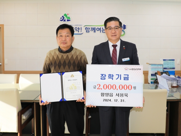 [아시아월드뉴스] 함양군은 갑진년 마지막날인 12월 31일 지역인재 육성을 염원하는 장학금 기탁 행렬이 이어지며 서용욱씨가 200만원, ㈜상림원 권태근 대표가 500만원, ㈜부농원 윤명일 대표가 300만원의 장학금을 기탁했다고 밝혔다.