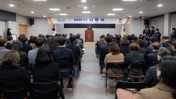이날 시무식은 순국선열과 호국영령 및 무안공항 여객기 사고 희생자에 대한 묵념을 시작으로 장재혁 부군수의 공무원 헌장 낭독, 표창 수여, 신년사, 군가 제창의 순으로 진행됐다.
