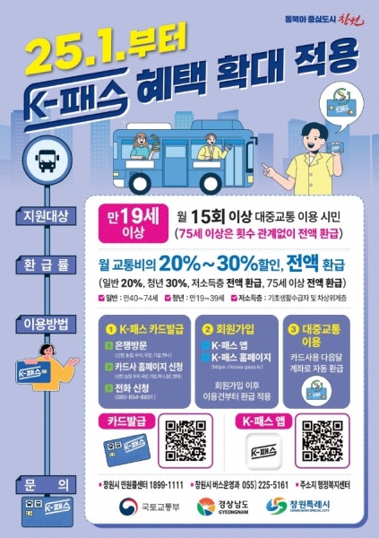 이종근 교통건설국장은 “이번 사업으로 창원시민이 대중교통비 부담이 많이 완화되길 바란다”며 “앞으로도 시민들이 K-패스를 통해 더 많은 혜택을 받을 수 있도록 노력하겠다”고 말했다.