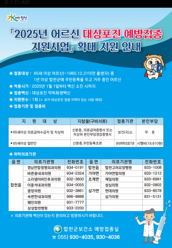 합천군보건소는 1년 이상 합천군에 주민등록을 둔 65세 이상 어르신 중 의료급여수급자 및 차상위본인부담경감대상자에 한해 보건소에서 접종을 지원한다.