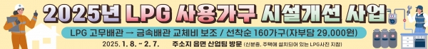 금속배관 교체를 원하는 가구는 1월 8일부터 2월 7일까지, 신분증과 LPG 고무호스 사진을 지참해 거주지 읍·면사무소 산업팀을 방문해 신청하면 된다.