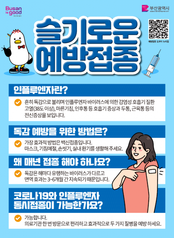 [아시아월드뉴스] 부산시는 독감 등 호흡기 감염병이 최근 8년 사이 전국적으로 최대 규모로 유행하고 있고 코로나19 입원환자 수가 증가하고 있어, 안전하고 건강한 설 연휴를 위해 65세 이상 어르신 등 고위험군의 예방접종을 당부한다고 밝혔다.