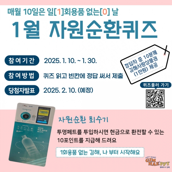 먼저 홀수달 10일마다 시의 자원순환정책을 소개한 후 퀴즈로 맞혀보는 온라인 이벤트를 진행하고 정답자 중 10명을 추첨해 김해사랑상품권을 제공한다.
