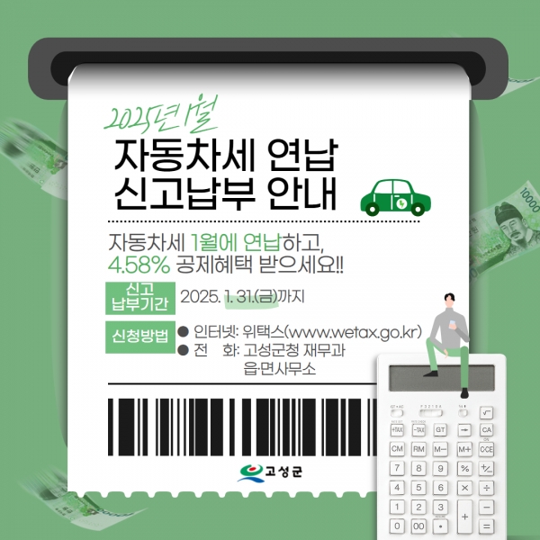 [아시아월드뉴스] 고성군은 2025년 자동차세 연납 신청을 1월 31일까지 접수한다.