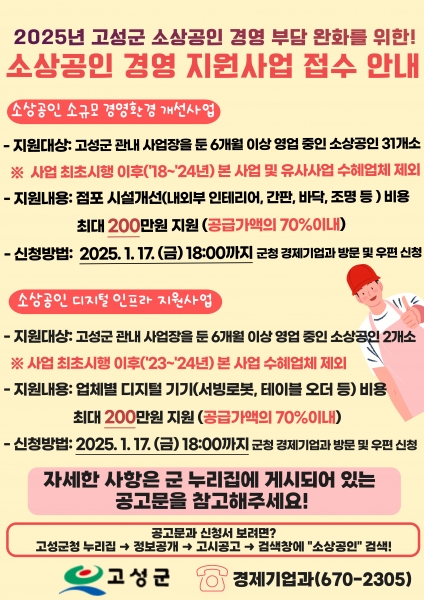 한 업체가 위 두 사업 모두 신청할 수 있고 사업 신청마감은 1월 17일 오후 6시까지이며 고성군청 경제기업과 방문 및 우편으로 신청이 가능하다.
