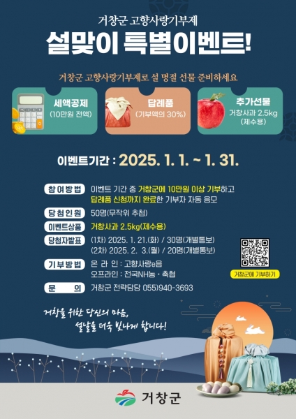 이번 설맞이 이벤트는 기부자에게 감사의 마음을 전하고자 설을 맞이해서 1월 1일부터 1월 31일 기간 중 거창군에 10만원 이상 기부를 한 기부자 중 무작위 추첨을 통해 50명에게 거창사과 2.5kg를 추가 답례품으로 제공하는 특별 이벤트이다.