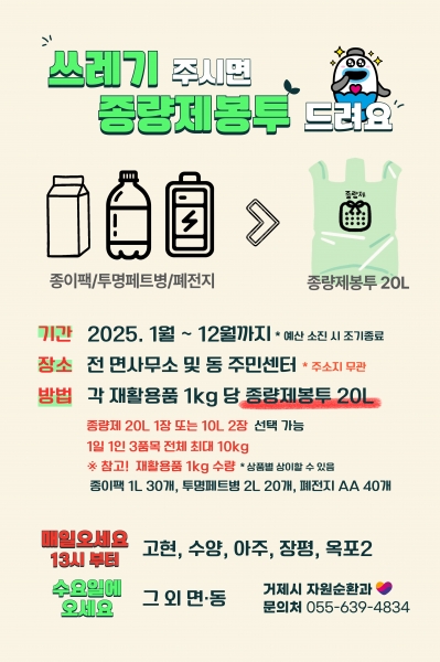 [아시아월드뉴스] 거제시는 지난해에 이어 올해도 종이팩류, 폐전지류, 투명페트병을 모아오면 종량제봉투로 교환해주는 ‘재활용품 교환사업’을 시행한다고 밝혔다.