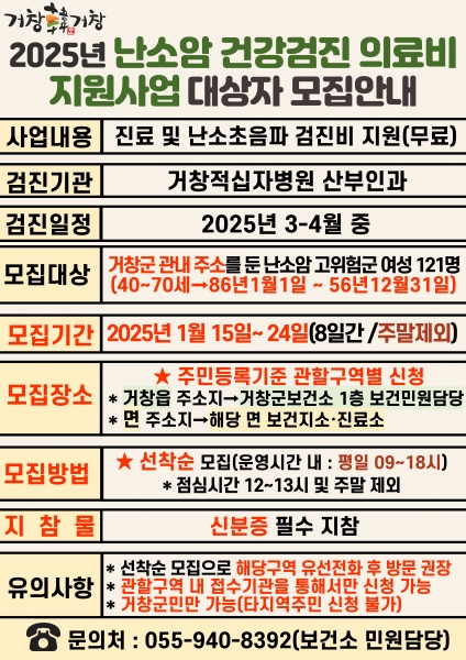 [아시아월드뉴스] 거창군은 1월 15일부터 24일까지 8일간 관내 주소를 둔 거창군민 중 난소암 고위험군 여성을 대상으로 검진 기회를 제공하는 ‘2025년 난소암 건강검진 의료비 지원사업’ 신청 희망자 121명을 선착순 모집한다고 밝혔다.