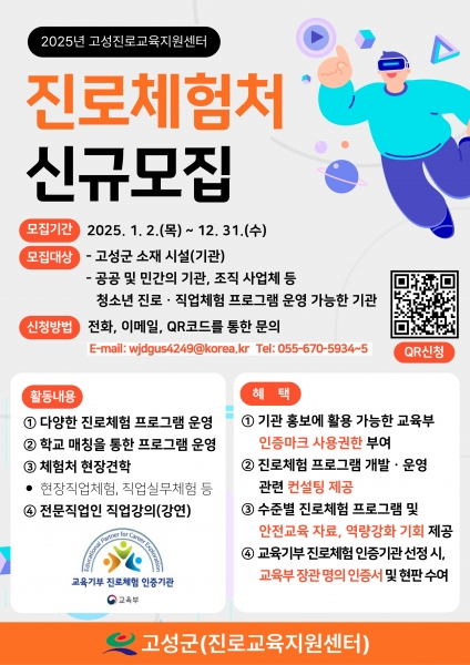 신청 대상은 고성군에 소재지를 두고 사업자등록증이 있으며 청소년 진로 교육에 관심 있는 사업장, 기관, 단체라면 누구나 신청할 수 있으다.