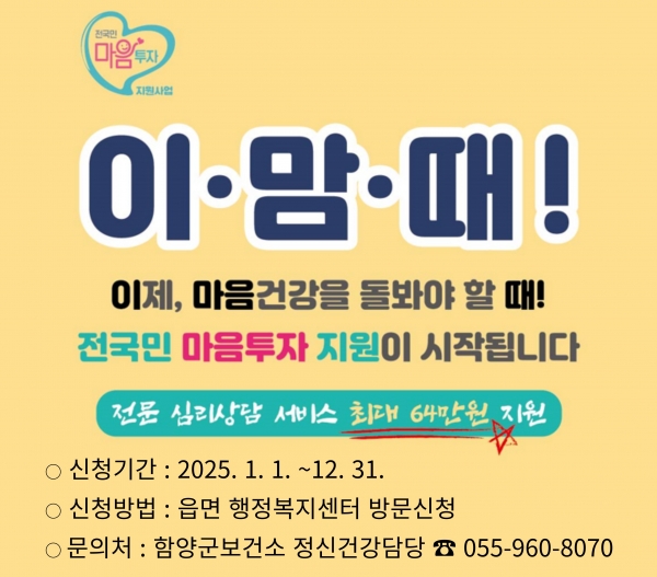 [아시아월드뉴스] 함양군보건소는 정서적 어려움을 겪는 군민들의 정신건강 증진을 위해 2025년 ‘전국민 마음투자 지원사업’을 본격적으로 추진한다고 밝혔다.