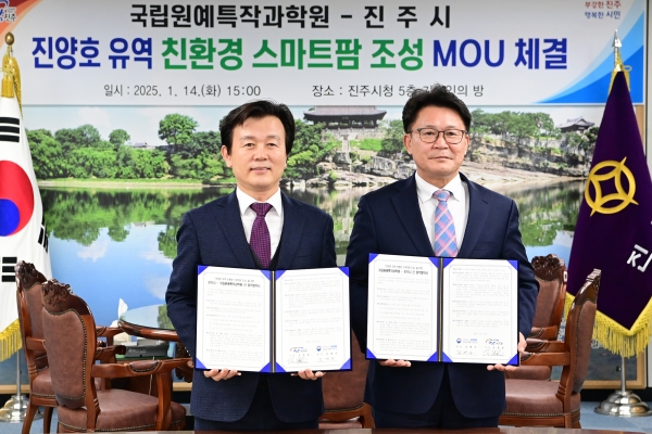 [아시아월드뉴스] 진주시와 전북 완주시에 있는 농촌진흥청 산하 국립원예특작과학원은 14일 진주시청 기업인의 방에서 ‘진양호 유역 친환경 스마트팜 조성’을 위한 업무협약을 체결했다.