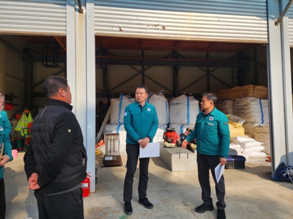 이어 면사무소의 수방자재 창고를 방문해 제설제의 적정량 확보와 보관 상태를 점검하고 제설 장비가 원활하게 작동할 수 있도록 정비 상태와 배치 상황도 확인했다.
