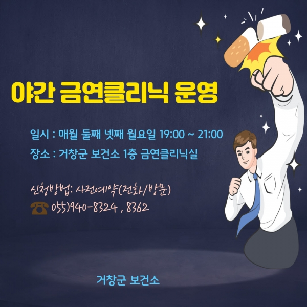 ‘야간 금연 클리닉’은 매월 둘째 주와 넷째 주 월요일 오후 7시부터 9시까지 거창군 보건소 1층 금연 클리닉실에서 진행된다.