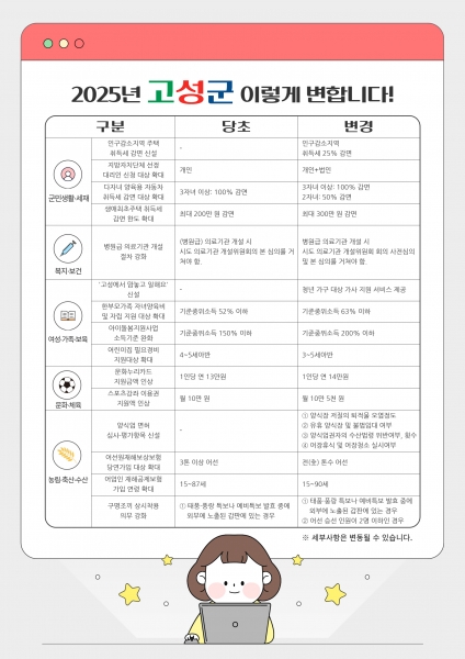 한편 ‘2025년 새해부터 달라지는 시책 및 제도’에 대한 자세한 사항은 고성군 누리집에서 확인할 수 있다.