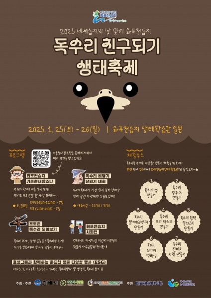 생태축제는 이틀간 오전 10시부터 오후 4시까지 철새 탐조단 활동과 함께 독수리와 관련된 체험공간, 화포천습지 사진전이 마련되는 것을 비롯해 청소년 환경백일장 수상작이 화포천 아우름길에 전시된다.