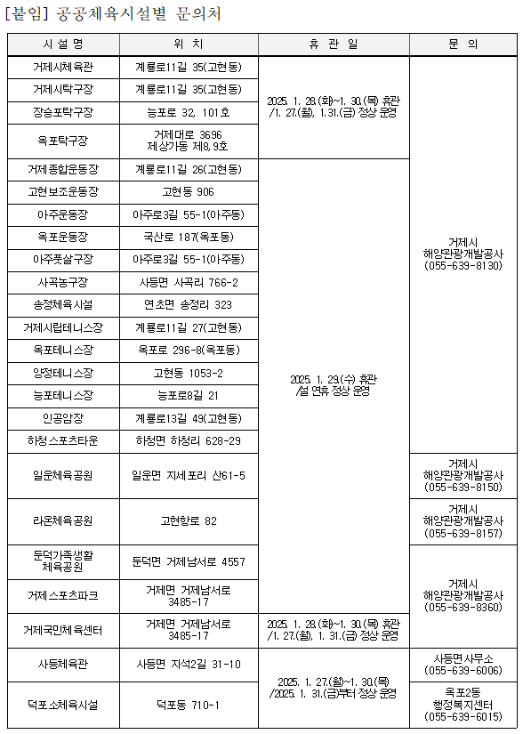 우리 시 관내 실내 체육시설의 휴관은 1월 28일부터 30일까지이고 실외 체육시설은 설날 당일인 1월 29일만 휴관하며 시설별 자세한 사항은 공공체육시설별 연락처로 문의하면 된다.