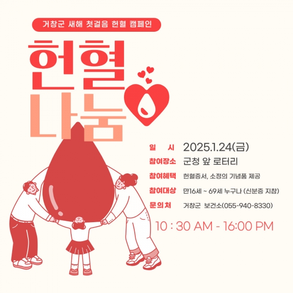 [아시아월드뉴스] 거창군은 오는 24일 오전 10시 30분부터 오후 4시까지 새해를 맞아 지역 주민과 함께하는 생명 나눔 헌혈 행사를 거창군청 앞 로터리에서 개최한다.