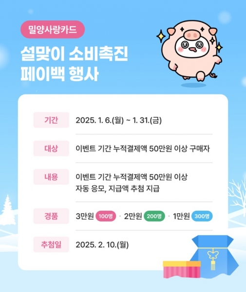 추첨 일자는 오는 2월 10일이며 밀양사랑카드 어플 푸시 알림으로 당첨 사실을 확인할 수 있다.