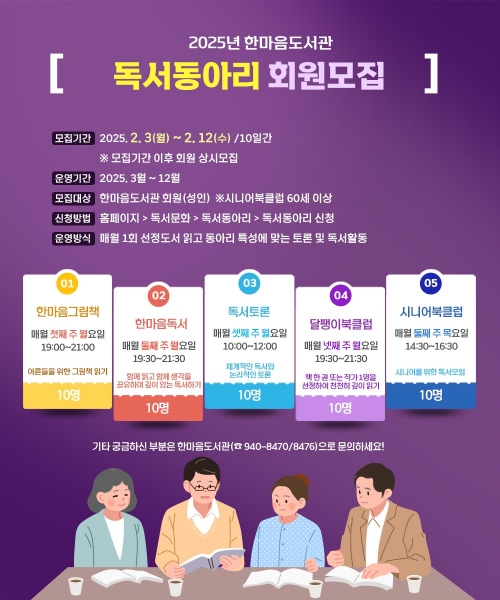 회원 신청은 2월 3일부터 한마음도서관 홈페이지를 통해 도서관 회원이면 누구나 가능하며 신청 기간 이후에도 상시 모집을 통해 언제든지 참여 기회를 제공할 계획이다.