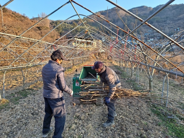 농가에서 고춧대, 깻대, 과수 전정 가지를 수확해 읍면 사무소에 신청을 하면 파쇄지원단이 출동하는 방식이다.