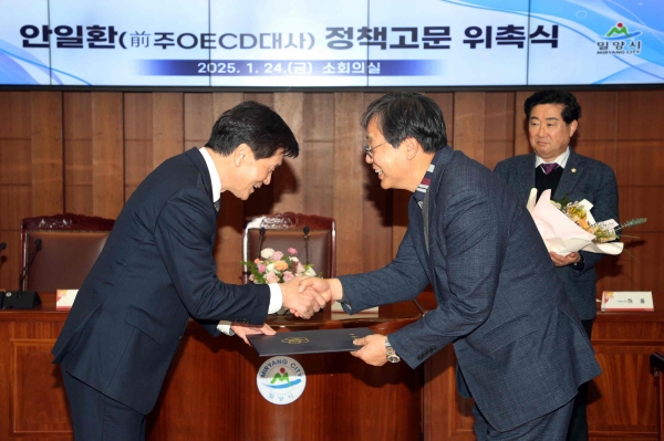 [아시아월드뉴스] 밀양시는 24일 밀양시 발전을 위한 정책 개발을 위해 안일환 전 대통령실 경제수석비서관을 정책고문으로 위촉했다고 밝혔다.