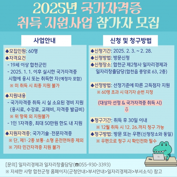 [아시아월드뉴스] 합천군은 2월 3일부터 2월 28일까지 2025년‘국가자격증 취득 지원사업’을 신청자를 모집한다고 밝혔다.