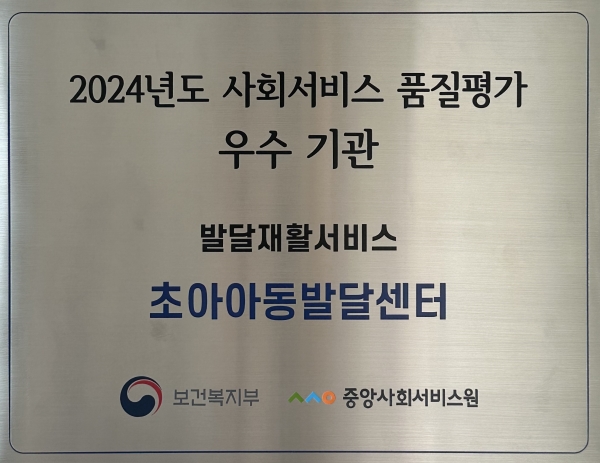한편 중앙사회서비스원이 주관한 2024년 사회서비스 품질평가 결과에서 평가대상 12곳 중 5곳이 A등급을 받았으며 그 중 초아아동발달센터는 A등급 중 상위 10%에 해당하는 기관으로 선정돼 보건복지부장관상을 수상하고 포상금 485만원과 우수기관 현판을 받게 됐다.