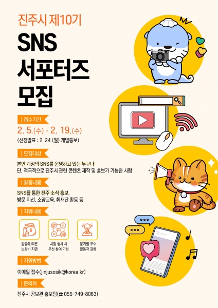 진주시 관계자는 “진주시 SNS 서포터즈의 활동을 통해 시민들이 더욱 친근하게 시정 소식을 접할 수 있도록 양방향 소통을 강화하겠다”며 “SNS 서포터즈가 진주의 이야기를 생생하게 전달하는 중요한 역할을 하고 있는 만큼, 진주시정에 관심 있는 시민들의 많은 참여를 부탁드린다”고 전했다.