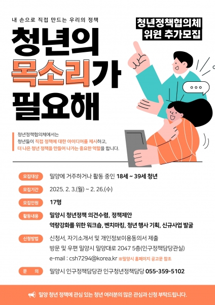 [아시아월드뉴스] 밀양시는 오는 26일까지 밀양시 청년정책협의체 위원 17명을 추가 모집한다고 밝혔다.