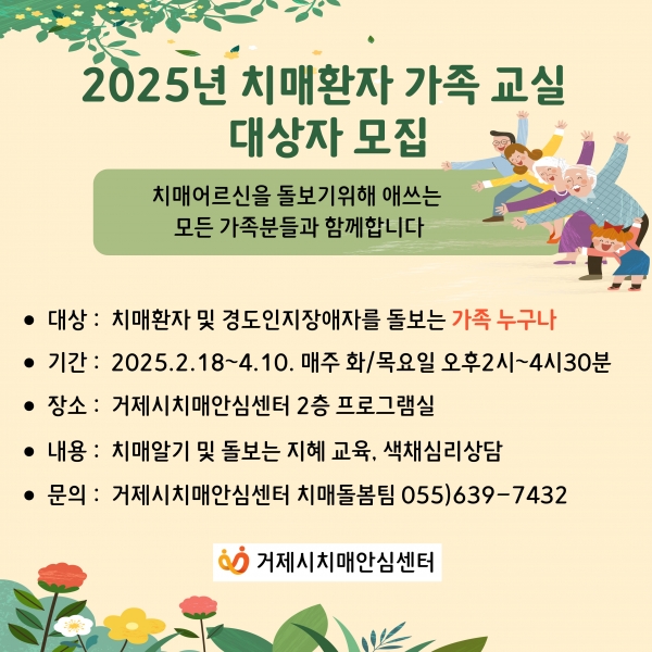 [아시아월드뉴스] 거제시치매안심센터에서는 치매환자 가족 및 보호자를 대상으로 하는 2025년 제1기 ‘헤아림 가족교실’ 참가자를 모집하고 있다.